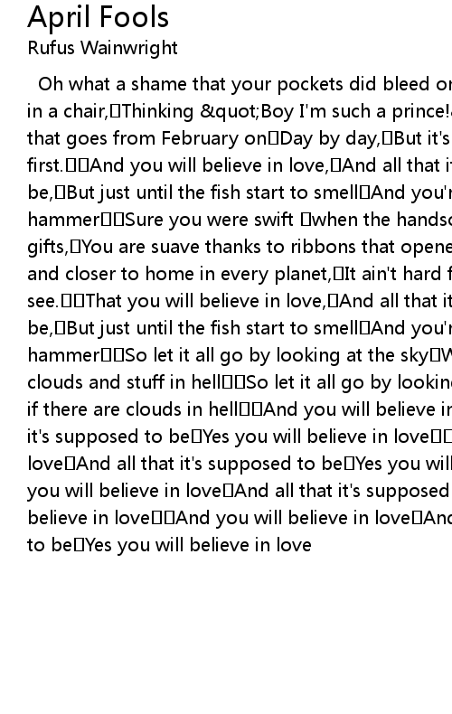 | Oh what a shame that your pockets did bleed on St. Valentine' s And you sat in a chair, Thinking quot Boy I' m such a prince! quot Well, life' s a train that goes from February on Day by day, But it' s making a stop on April first. And you will believe in love, And all that it' s supposed to be, But just until the fish start to smell And you' re struck down by a hammer Sure you were swift when the handsome Greek boys dropped by with gifts, You are suave thanks to ribbons that opened sesame. But in the stars and closer to home in every planet, It ain' t hard for me and dear JoJo to see. That you will believe in love, And all that it' s supposed to be, But just until the fish start to smell And you' re struck down by a hammer So let it all go by looking at the sky Wondering if there are clouds and stuff in hell So let it all go by looking at the sky Wondering if there are clouds in hell And you will believe in love And all that it' s supposed to be Yes you will believe in love And you will believe in love And all that it' s supposed to be Yes you will believe in love But you will believe in love And all that it' s supposed to be Yes you will believe in love And you will believe in love And all that it' s supposed to be Yes you will believe in love |