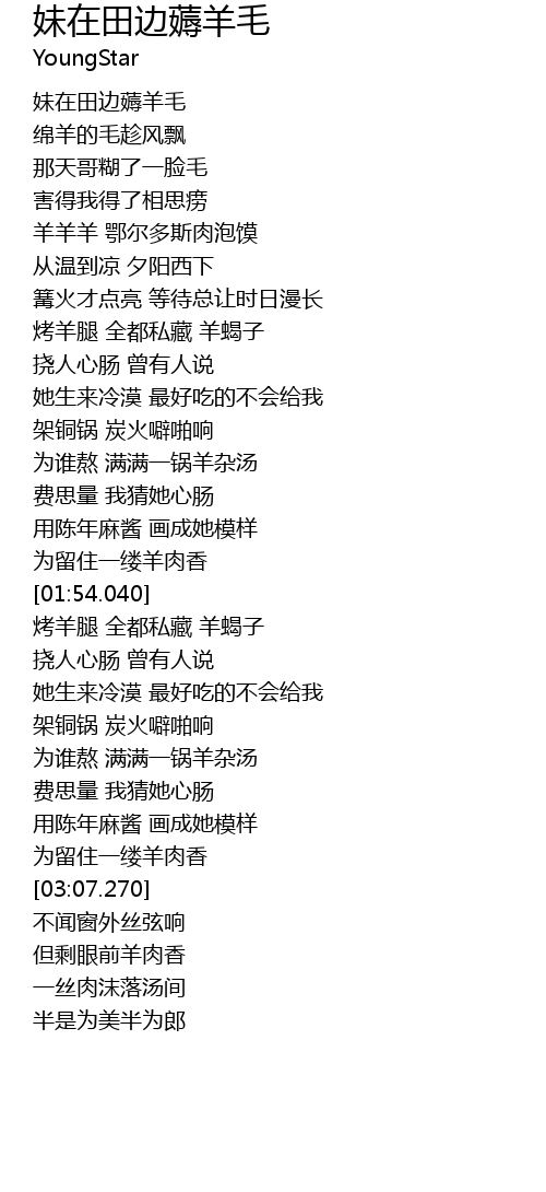 | [02:38.470] | 为谁熬 满满一锅羊杂汤 |
