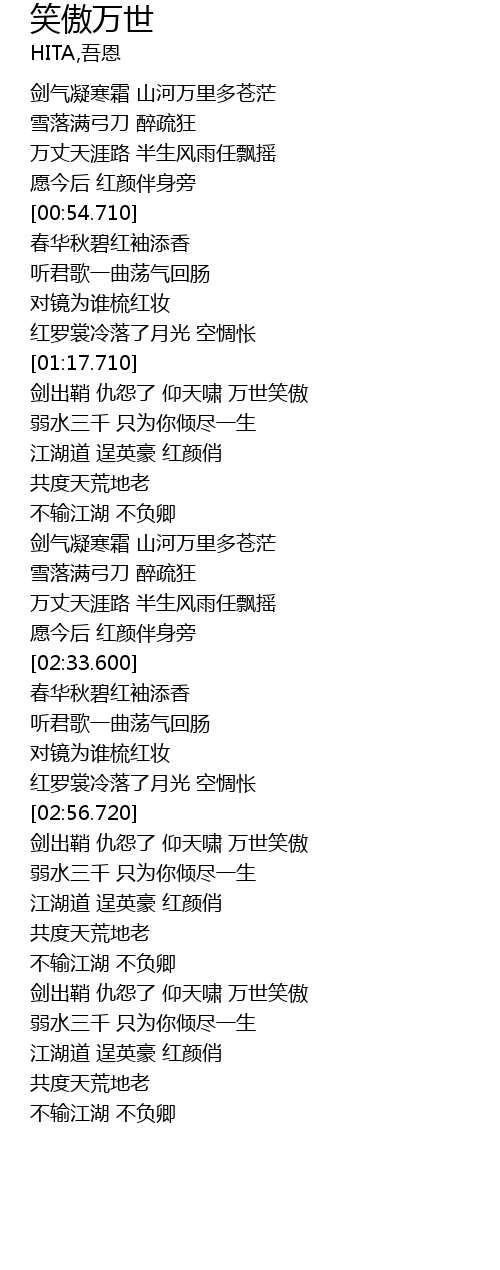 | [02:57.000] | 剑出鞘 仇怨了 仰天啸 万世笑傲 |