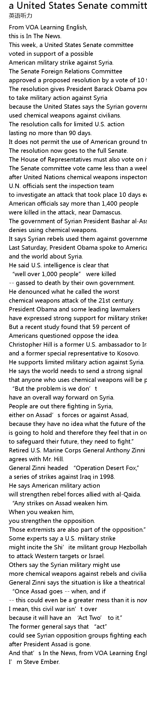 | Song | a United States Senate committee voted in support of a possible American military strike against Syria |