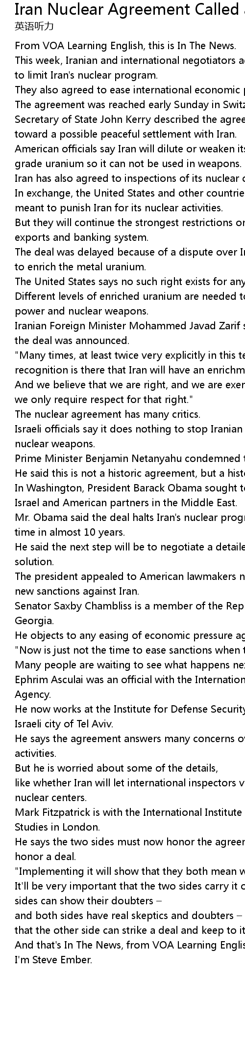 | [00:31.88] | Secretary of State John Kerry described the agreement as a first step toward a possible peaceful settlement with Iran. |