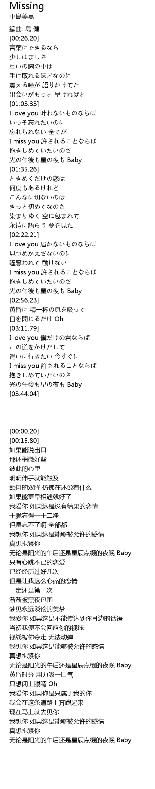 | [01:18.76] | I miss you 許されることならば |