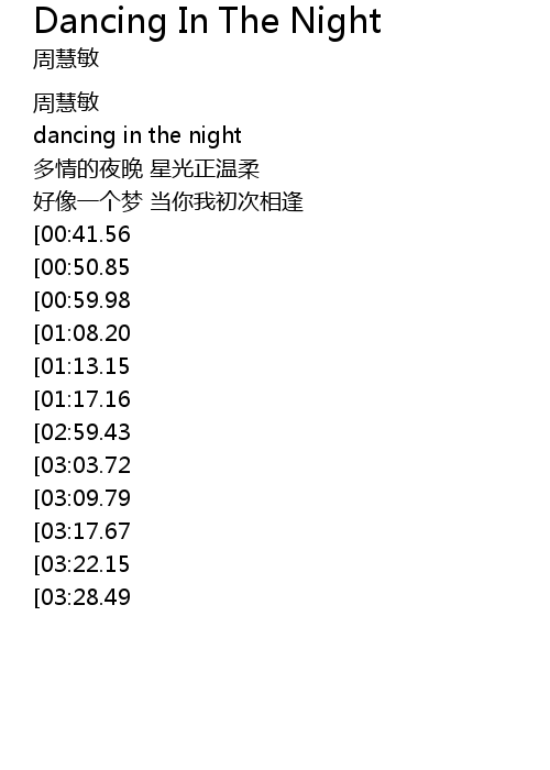 | [03:45.94][02:59.43][01:22.57] | Dancing in the night dancing in the night |