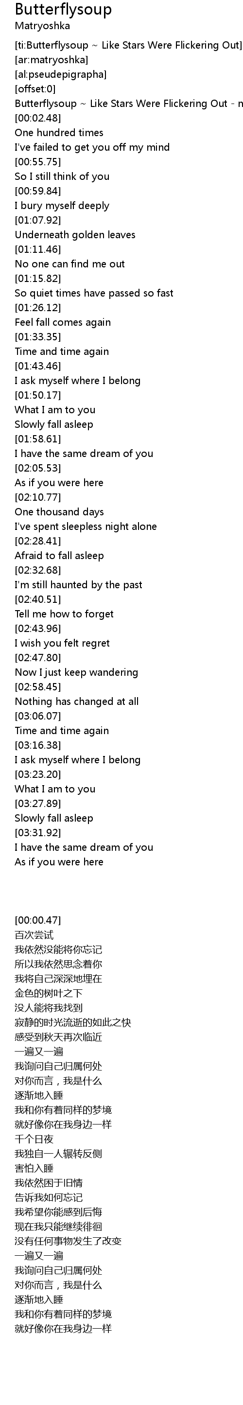 [ti:Butterflysoup ~ Like Stars Were Flickering Out] |