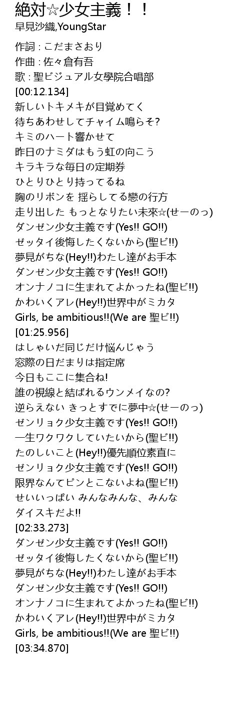 | [03:16.036] | ダンゼン少女主義です(Yes!! GO!!) |