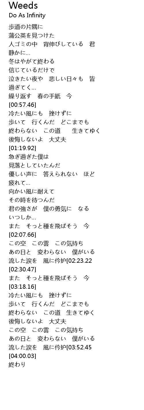 | [03:28.43] | 終わらない この道 生きてゆく |