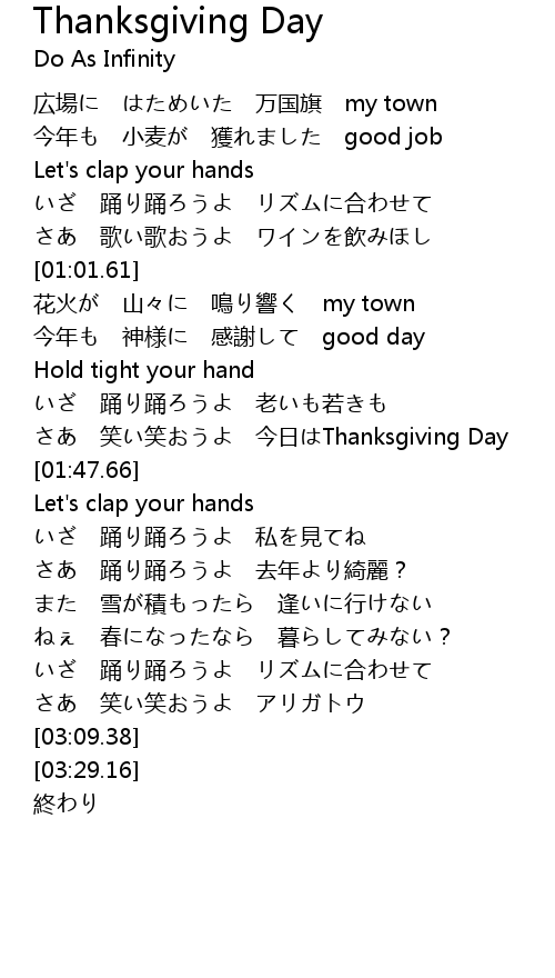 | [01:40.45] | さあ 笑い笑おうよ 今日はThanksgiving Day |