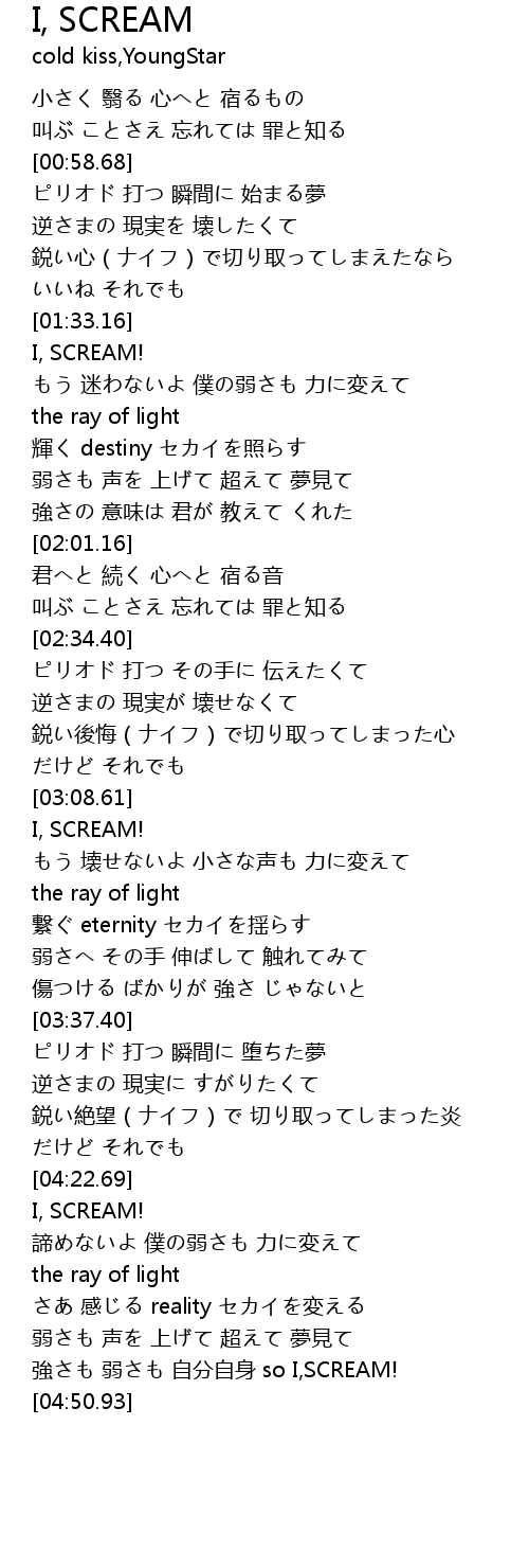 | [04:45.46] | 強さも 弱さも 自分自身 so I,SCREAM! |