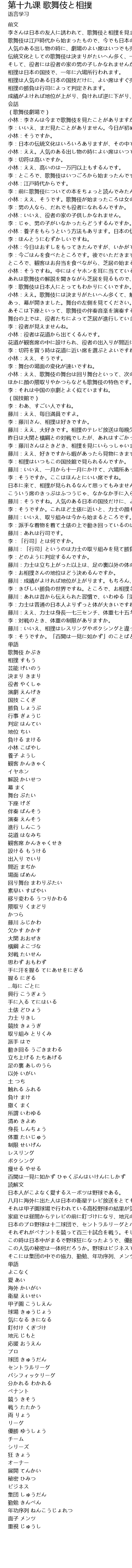 | [00:10.6] | 李さんは日本の友人に誘われて、歌舞伎と相撲を見ました。 |