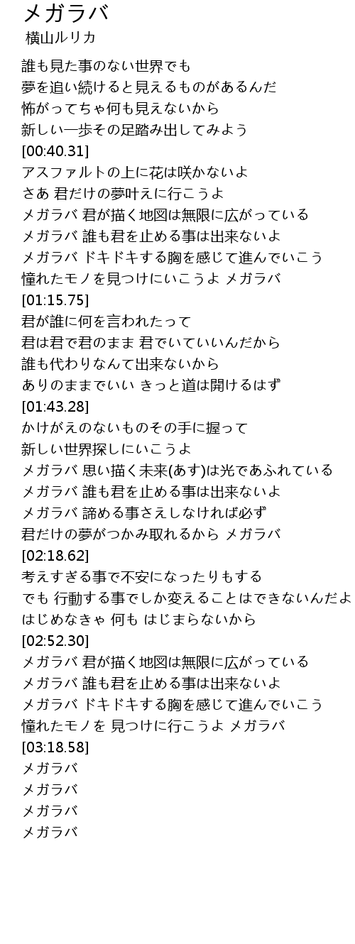 | [03:00.19] | メガラバ 誰も君を止める事は出来ないよ |