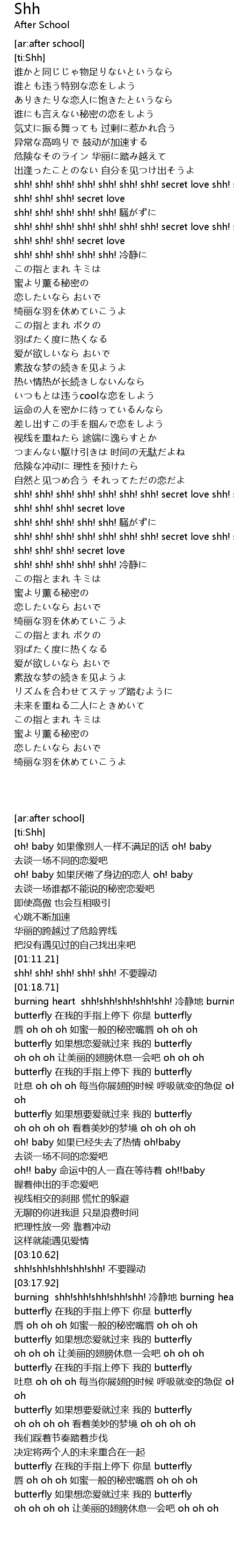 | [01:11.21] | shh! shh! shh! shh! shh! shh! shh! secret love shh! shh! shh! shh! shh! shh! shh! secret love |