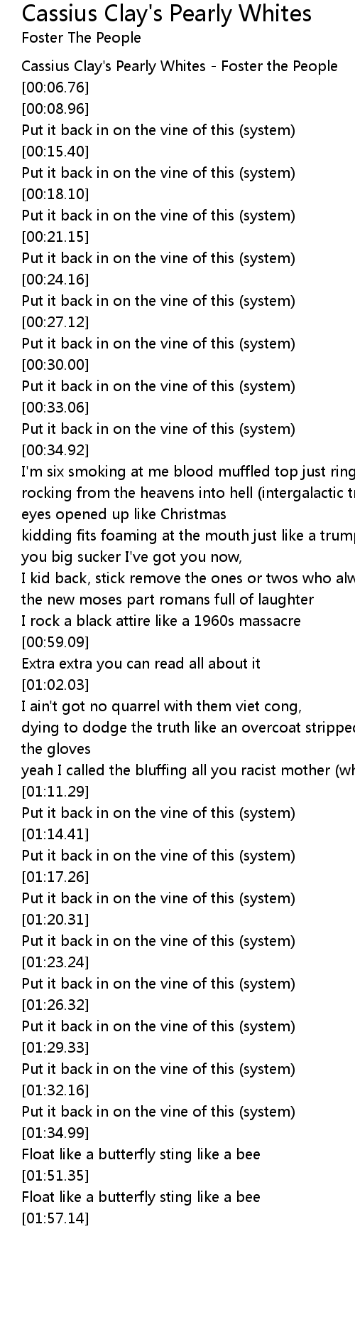 [00:01.39] Cassius Clay's Pearly Whites - Foster the People