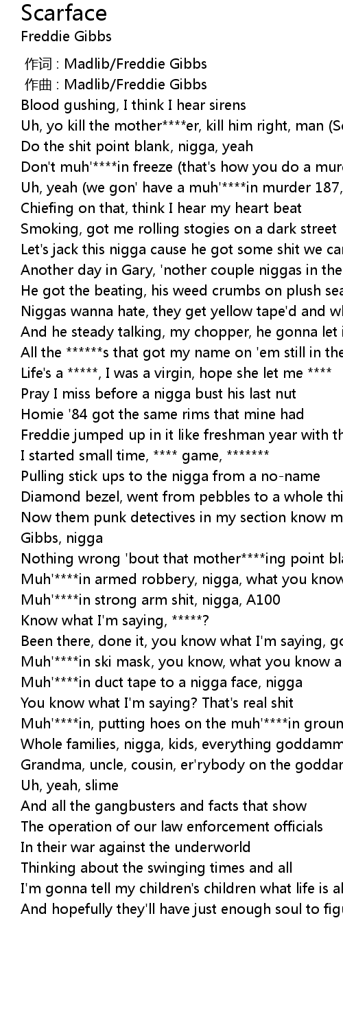 | [00:08.104] | Uh, yo kill the mother er, kill him right, man Scarface |