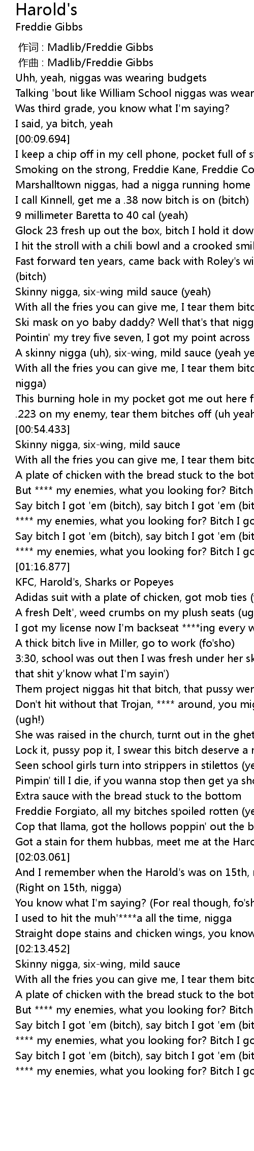 | [02:03.562] | And I remember when the Harold' s was on 15th, nigga |