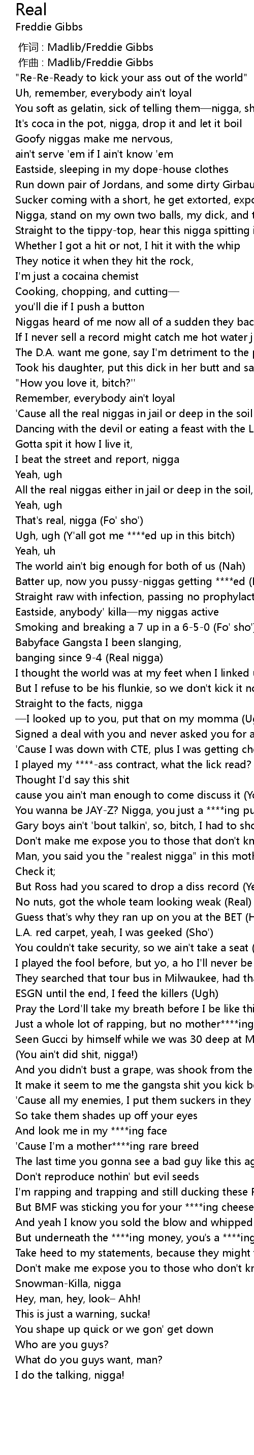 | [01:49.327] | Man, you said you the "realest nigga" in this mother****er? |