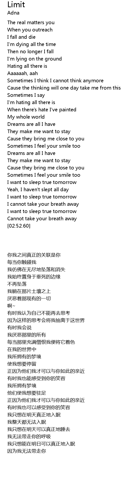 | [02:18.77] | I want to sleep true tomorrow |