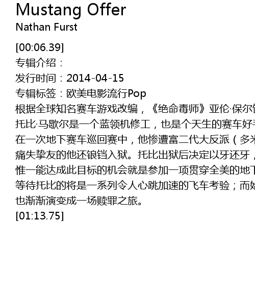 | [00:23.40] | 根据全球知名赛车游戏改编,《绝命毒师》亚伦·保尔饰演的主人公 |