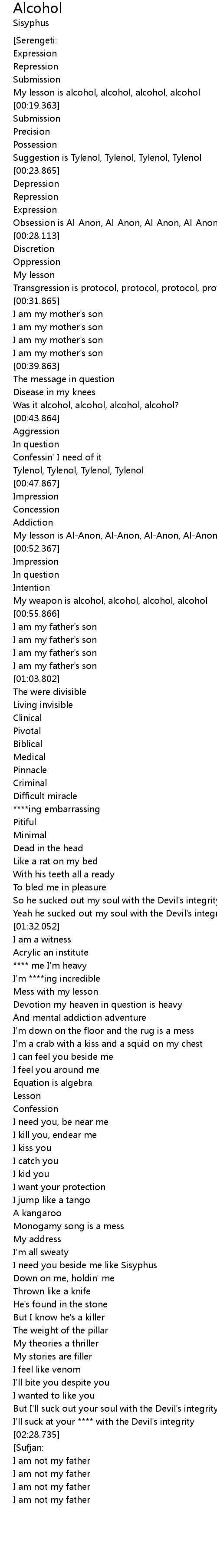 | [00:19.116] | My lesson is alcohol, alcohol, alcohol, alcohol |
