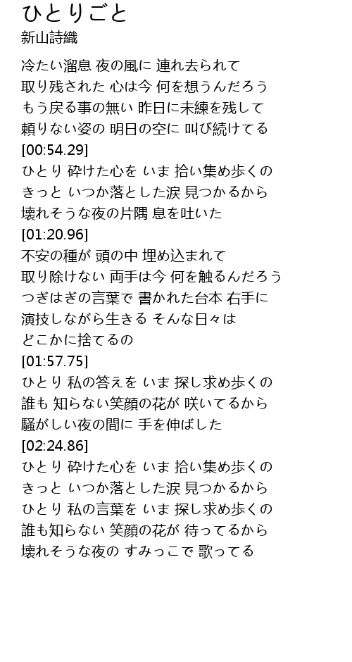 | [00:54.59] | ひとり 砕けた心を いま 拾い集め歩くの |