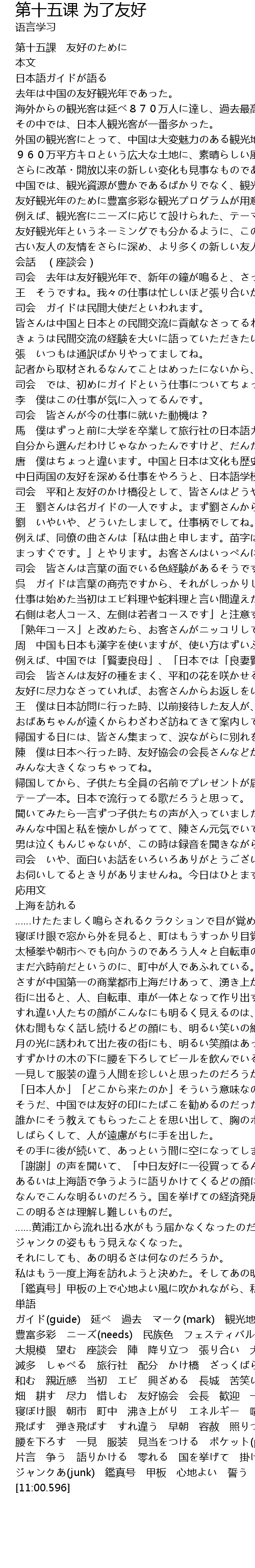 | [05:23.073] | 陳 僕は日本へ行った時、友好協会の会長さんなどが来てくださったし、以前接待した子供たちまでが歓迎に集まってくれました。 |