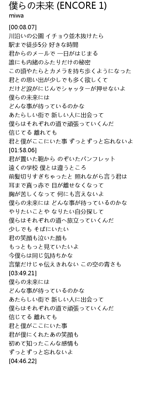 | [02:47.89] | 僕らの未来には どんな事が待っているのかな |