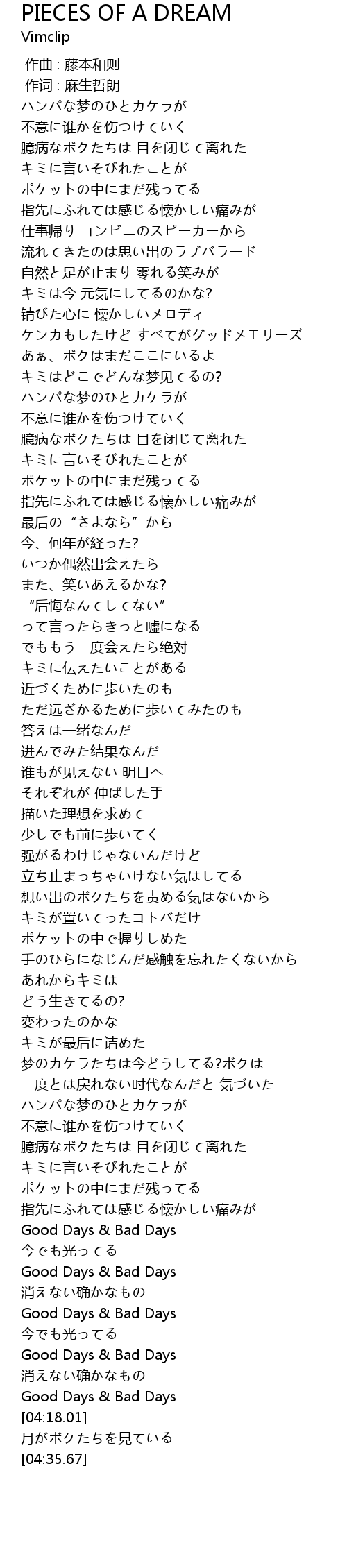 | [00:03.52] | ハンパな梦のひとカケラが 不意に谁かを伤つけていく |