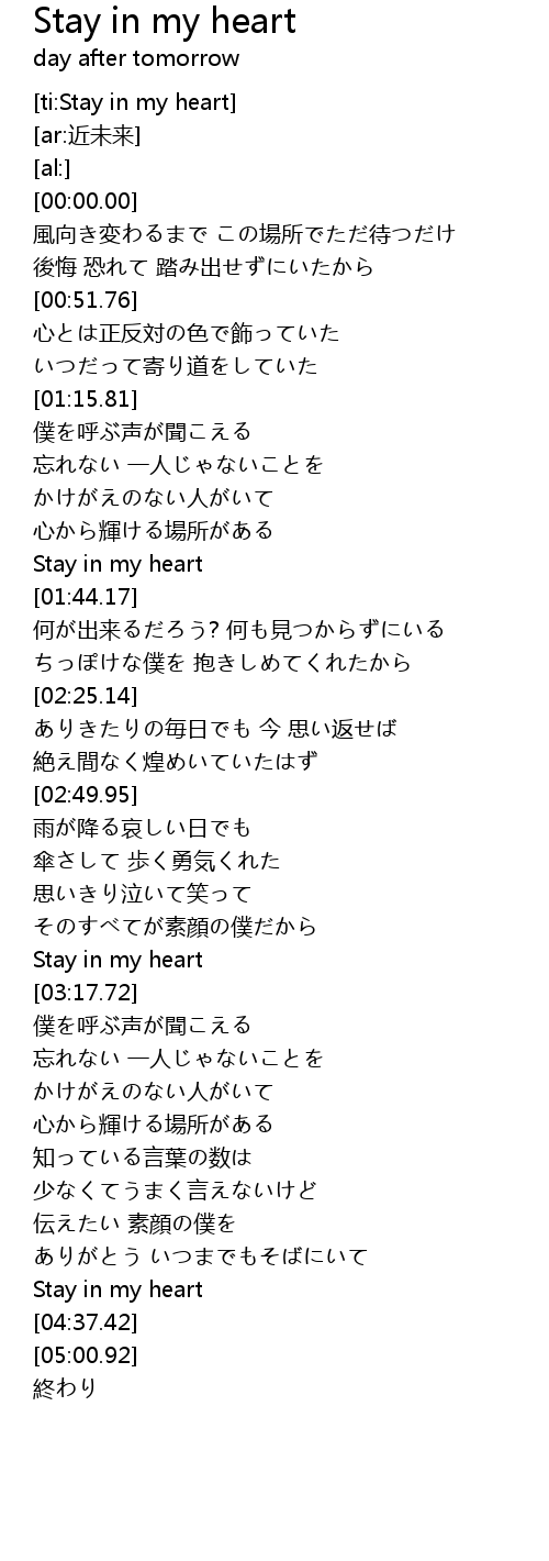 | [04:28.67] | ありがとう いつまでもそばにいて |