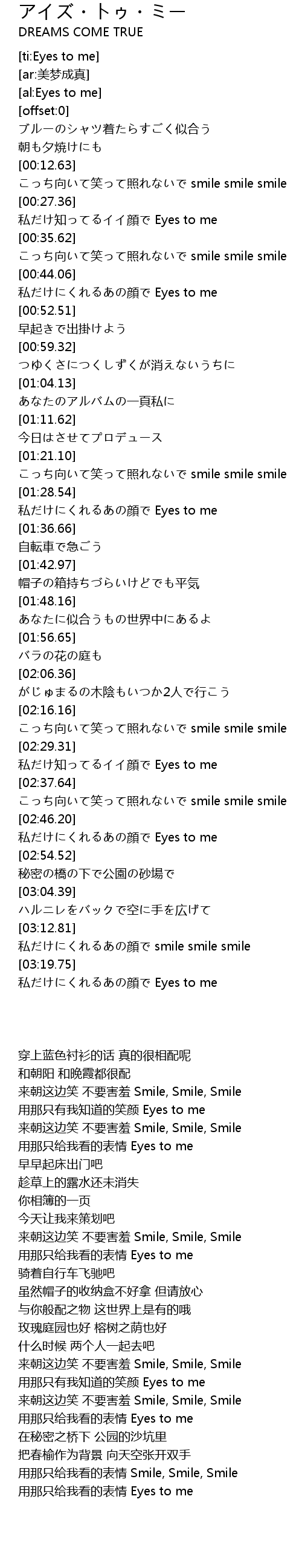 | [03:22.19] | 私だけにくれるあの顔で Eyes to me |