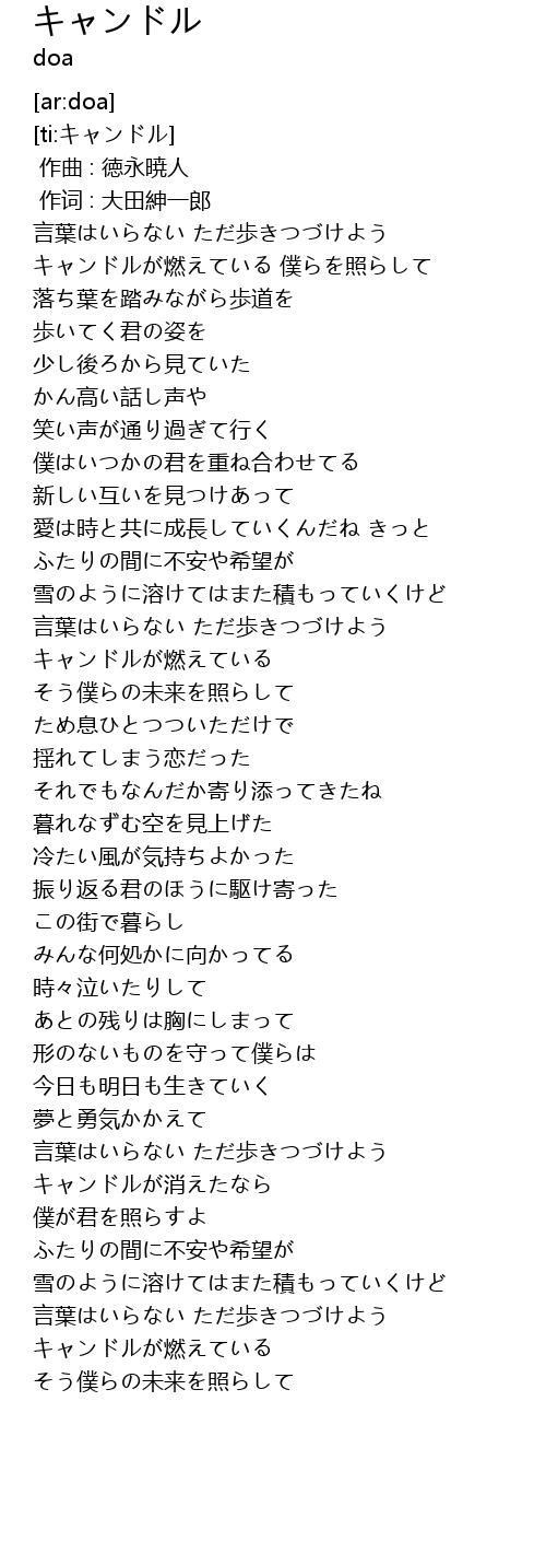 | [00:12.92] | キャンドルが燃えている 僕らを照らして |