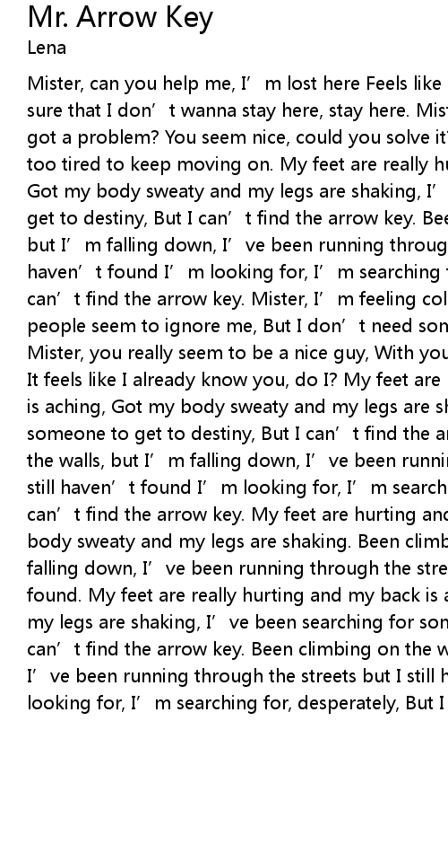 | Mister, can you help me, I' m lost here Feels like I' m getting nowhere, I' m sure that I don' t wanna stay here, stay here. Mister, can' t you see I' ve got a problem? You seem nice, could you solve it? My bag is heavy and I' m way too tired to keep moving on. My feet are really hurting and my back is aching, Got my body sweaty and my legs are shaking, I' ve been searching for someone to get to destiny, But I can' t find the arrow key. Been climbing on the walls, but I' m falling down, I' ve been running through the streets but I still haven' t found I' m looking for, I' m searching for, desperately, But I can' t find the arrow key. Mister, I' m feeling cold and I' m lonely, The people seem to ignore me, But I don' t need someone to guide me, guide me. Mister, you really seem to be a nice guy, With your moustache and your kind eyes It feels like I already know you, do I? My feet are really hurting and my back is aching, Got my body sweaty and my legs are shaking, I' ve been searching for someone to get to destiny, But I can' t find the arrow key. Been climbing on the walls, but I' m falling down, I' ve been running through the streets but I still haven' t found I' m looking for, I' m searching for, desperately, But I can' t find the arrow key. My feet are hurting and my back is aching, Got my body sweaty and my legs are shaking. Been climbing on the walls, but I' m falling down, I' ve been running through the streets but I still haven' t found. My feet are really hurting and my back is aching, Got my body sweaty and my legs are shaking, I' ve been searching for someone to get to destiny, But I can' t find the arrow key. Been climbing on the walls, but I' m falling down, I' ve been running through the streets but I still haven' t found I' m looking for, I' m searching for, desperately, But I can' t find the arrow key. |