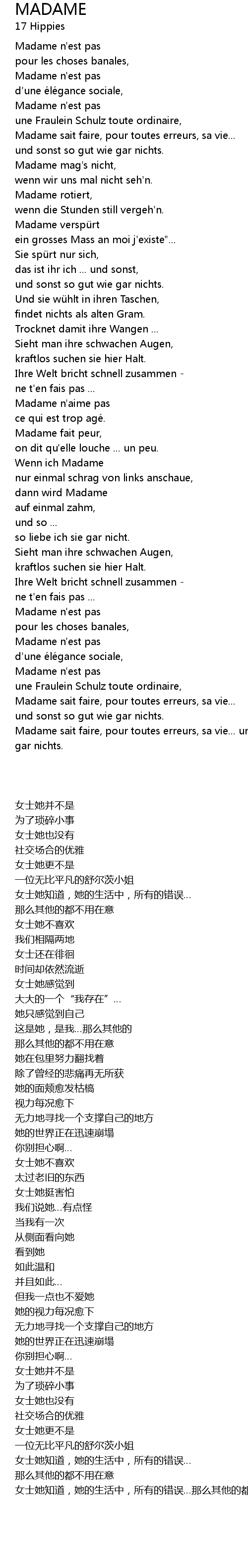 | [03:20.47] | Madame sait faire, pour toutes erreurs, sa vie... und sonst so gut wie gar nichts. |