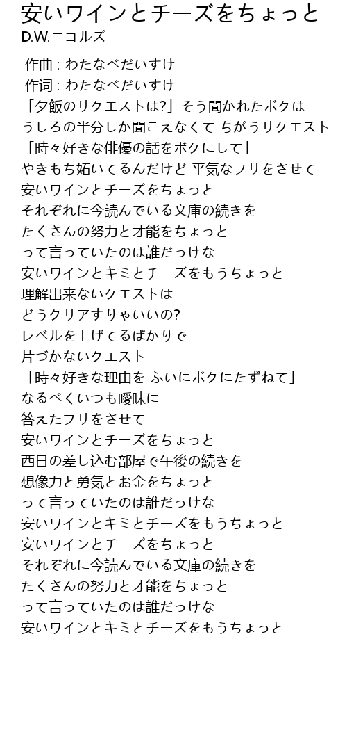 | [00:50.19] | 安いワインとキミとチーズをもうちょっと |