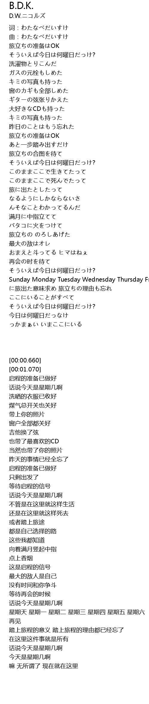 | [03:00.550] | Sunday Monday Tuesday Wednesday Thursday Friday Saturday サラバイ |