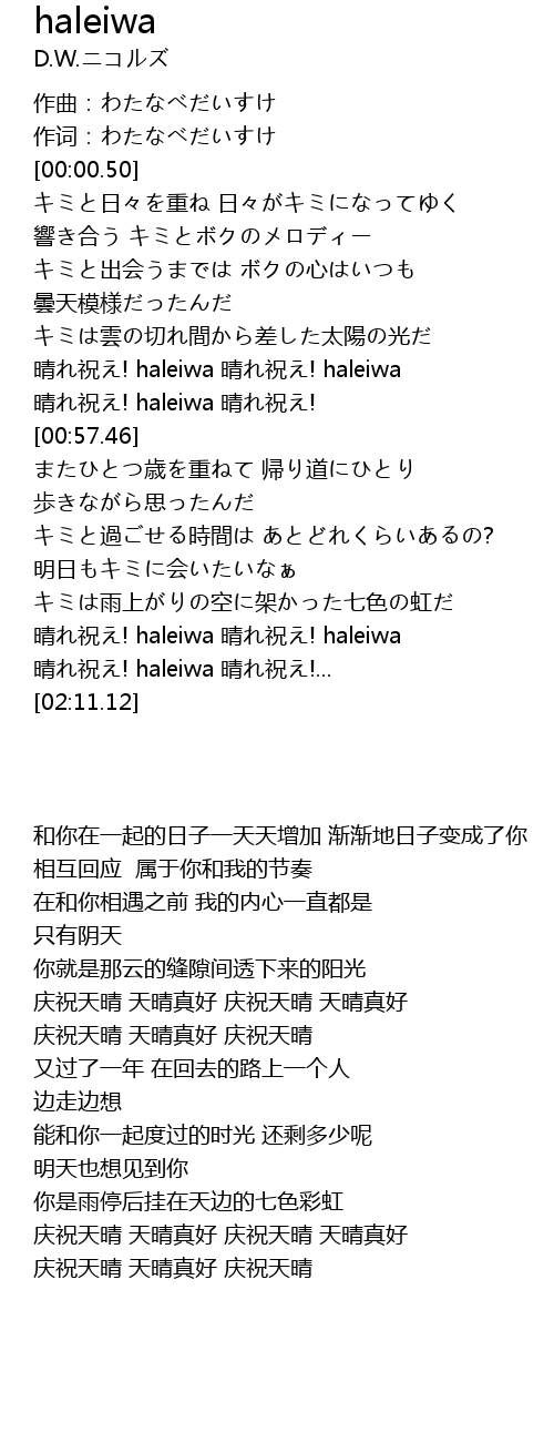 | [00:51.21] | 晴れ祝え! haleiwa 晴れ祝え! |