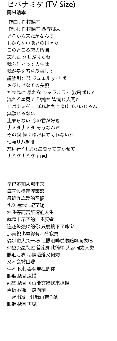 | [00:53.83] | ビバナミダ こぼれおちてゆけばいいじゃん |