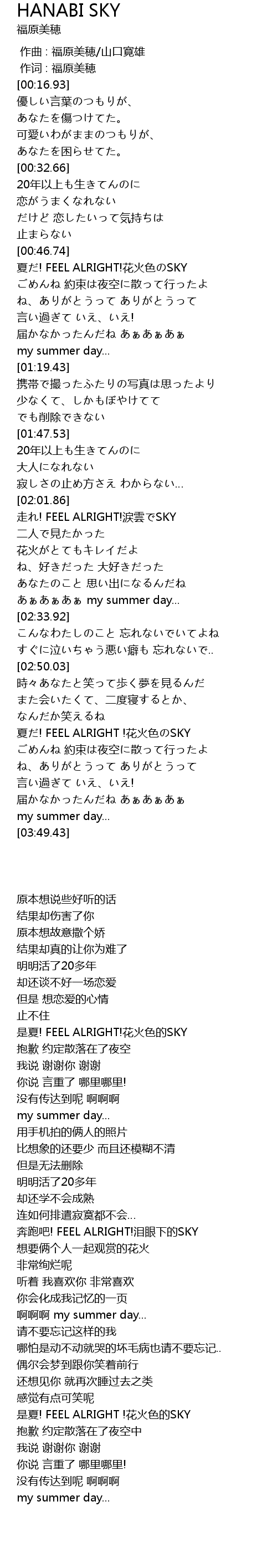 | [03:17.30] | xià! FEEL ALRIGHT ! huā huǒ sè SKY |