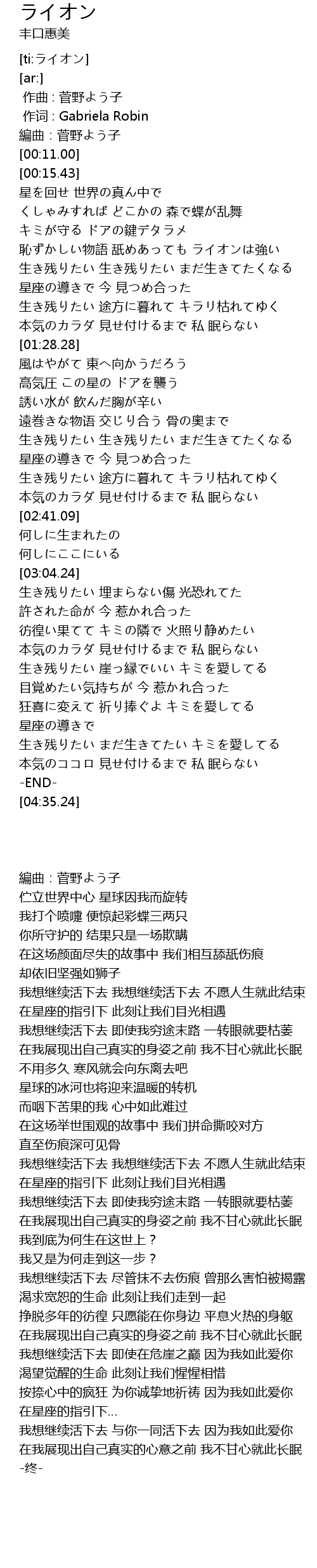 | [02:24.89] | 生き残りたい 途方に暮れて キラリ枯れてゆく |