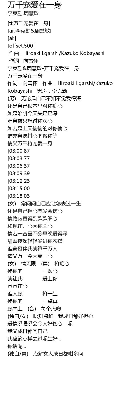 | [00:02.71] | 李克勤&周慧敏-万千宠爱在一身 |