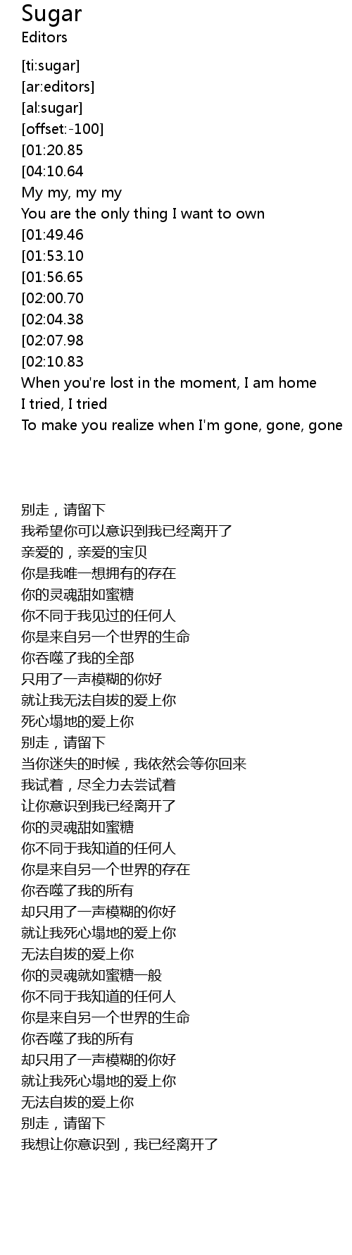 | [00:49.79][01:49.46][02:40.75] | There's sugar on your soul |