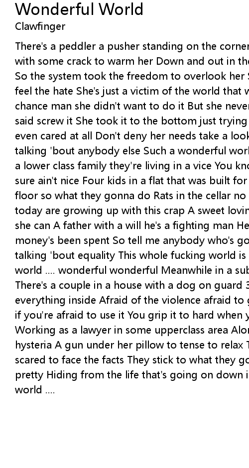 There's a peddler a pusher standing on the corner There'a a junky on the streets with some crack to warm her Down and out in the city she's working as a hooker So the system took the freedom to overlook her She don't exist that's made her feel the hate She's just a victim of the world that we create She didn't have a chance man she didn't want to do it But she never got the choice so she just said screw it She took it to the bottom just trying it all Knowing that nobody even cared at all Don't deny her needs take a look at yourself Before you start talking 'bout anybody else Such a wonderful world such a wonderful world There's a lower class family they're living in a vice You know it ain't to bad but it sure ain't nice Four kids in a flat that was built for two Cockroaches on the floor so what they gonna do Rats in the cellar no water in the tap The kids of today are growing up with this crap A sweet loving mother she does everything she can A father with a will he's a fighting man He's lost his job and all the money's been spent So tell me anybody who's gonna pay the rent And you're all talking 'bout equality This whole fucking world is insanity Such a wonderful world .... wonderful wonderful Meanwhile in a suburb on some fancy boulevard There's a couple in a house with a dog on guard 3 cars in the garage they keep everything inside Afraid of the violence afraid to go outside Money ain't funny if you're afraid to use it You grip it to hard when you're afraid to loose it Working as a lawyer in some upperclass area Alone at home his wife going into hysteria A gun under her pillow to tense to relax To rich to face reality to scared to face the facts They stick to what they got and they try to make it pretty Hiding from the life that's going on down in the city Such a wonderful world .... |