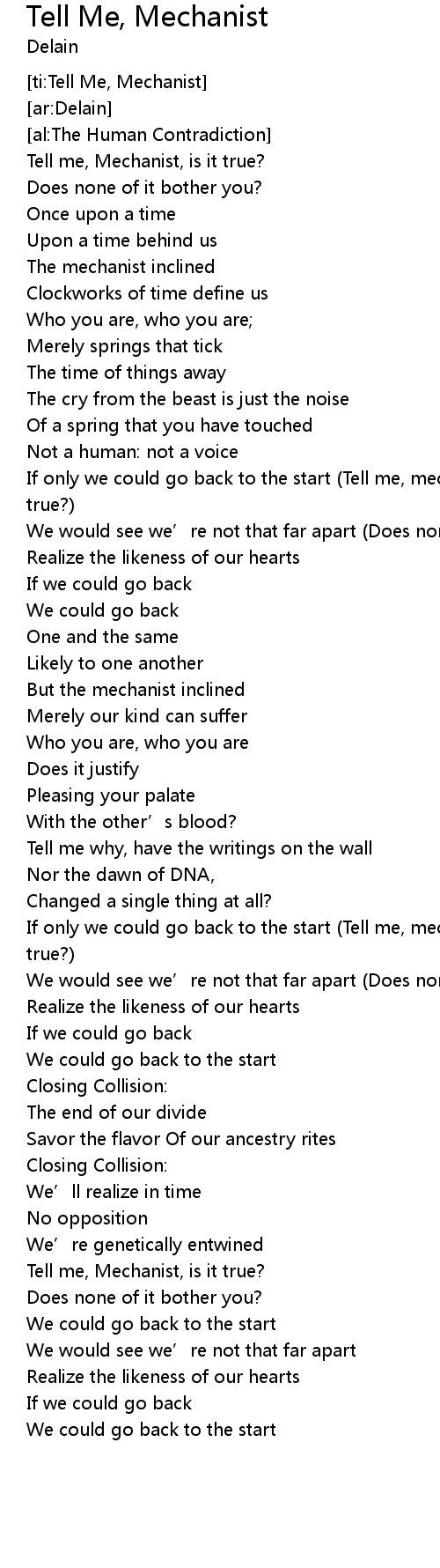 | [01:24.17] | If only we could go back to the start Tell me, mechanist, is it true? |