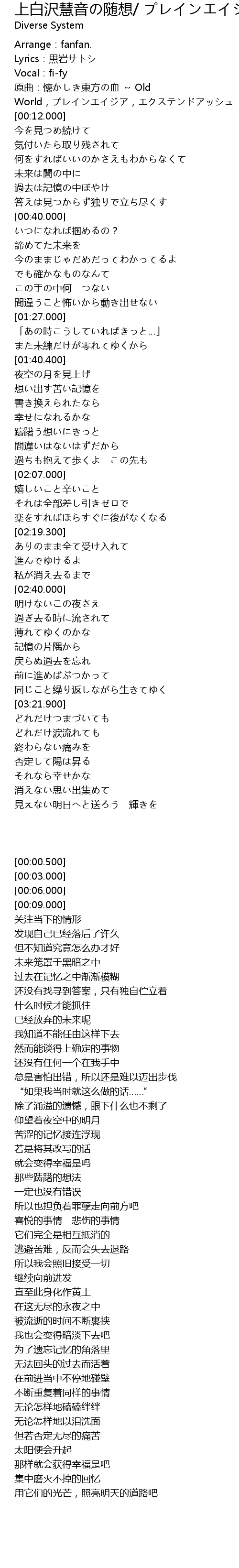 | [00:09.000] | 原曲:懐かしき東方の血 ~ Old World,プレインエイジア,エクステンドアッシュ ~ 蓬莱人 |