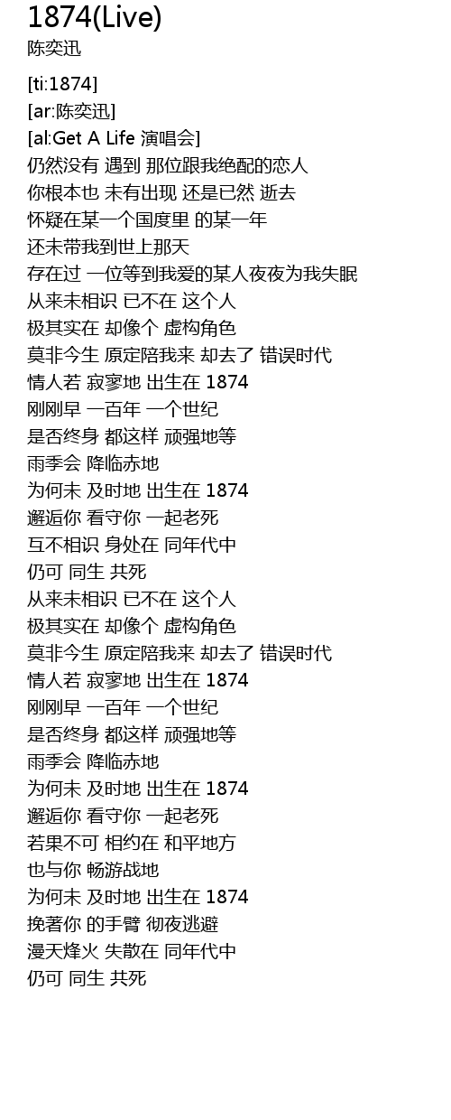 | [01:56.20] | 为何未 及时地 出生在 1874 |