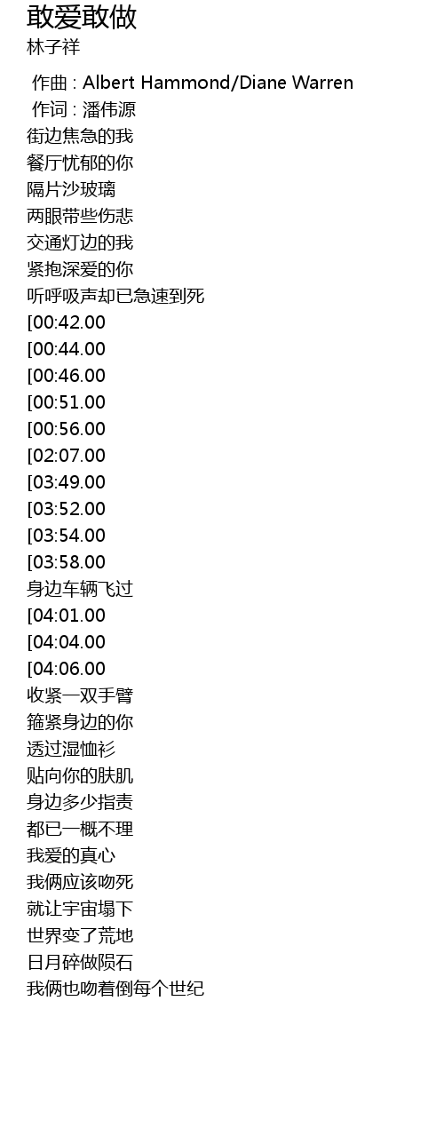 | [00:00.00] | 作曲 : Albert Hammond/Diane Warren |