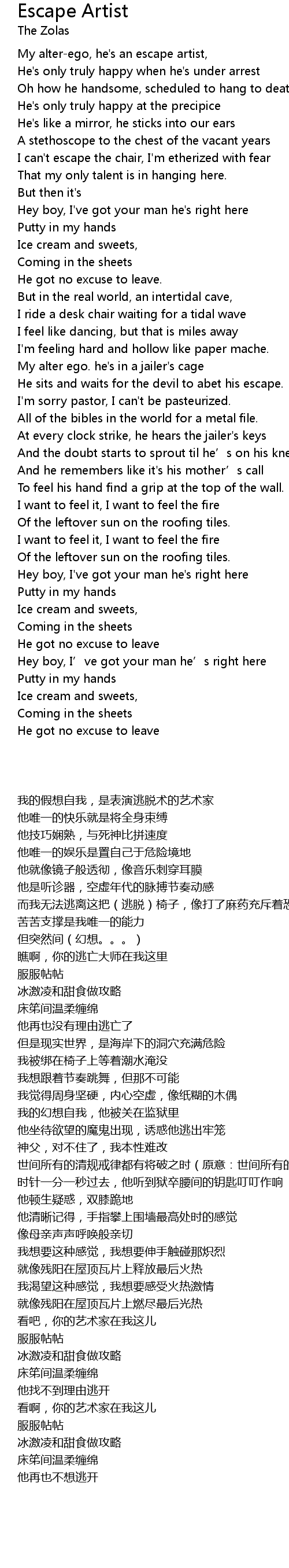 | [00:15.27] | My alterego, he' s an escape artist, |