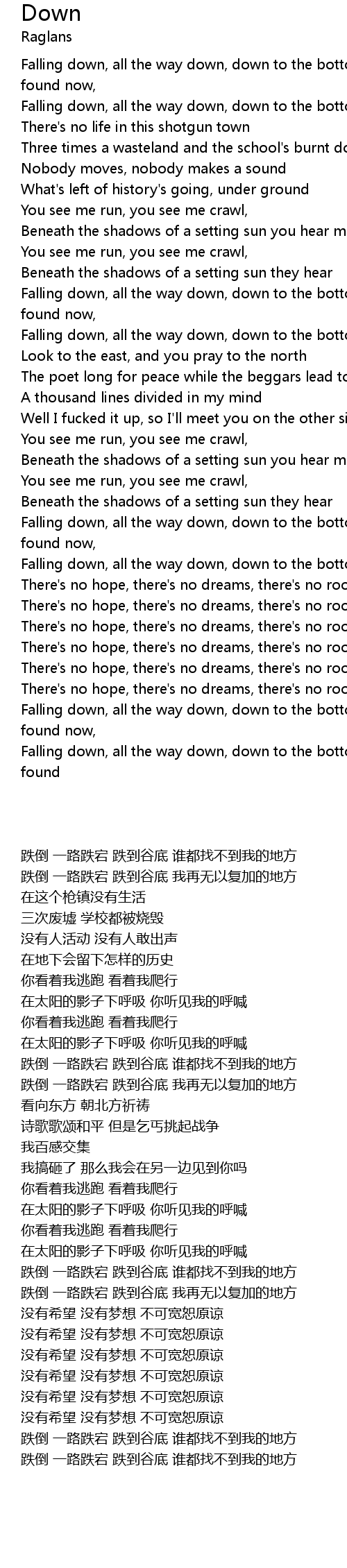 | [00:00.01] | Falling down, all the way down, down to the bottom where I can't be found now, |