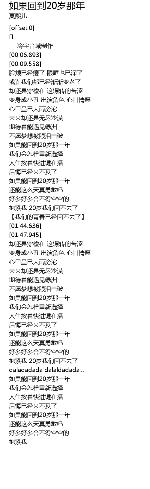 | [01:08.283] | ru guo neng hui dao 20 sui na yi nian |