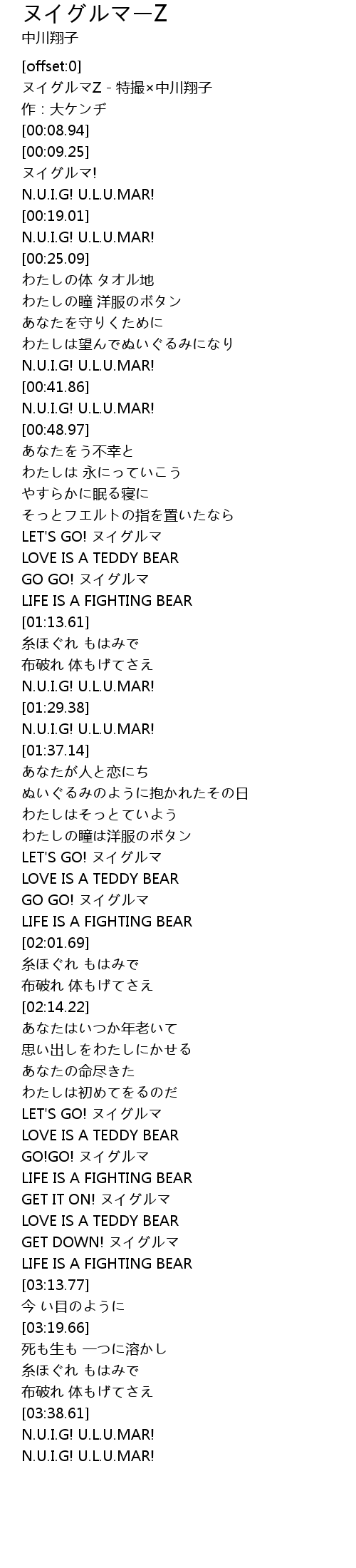 | [01:02.69] | LET'S GO! ヌイグルマ |