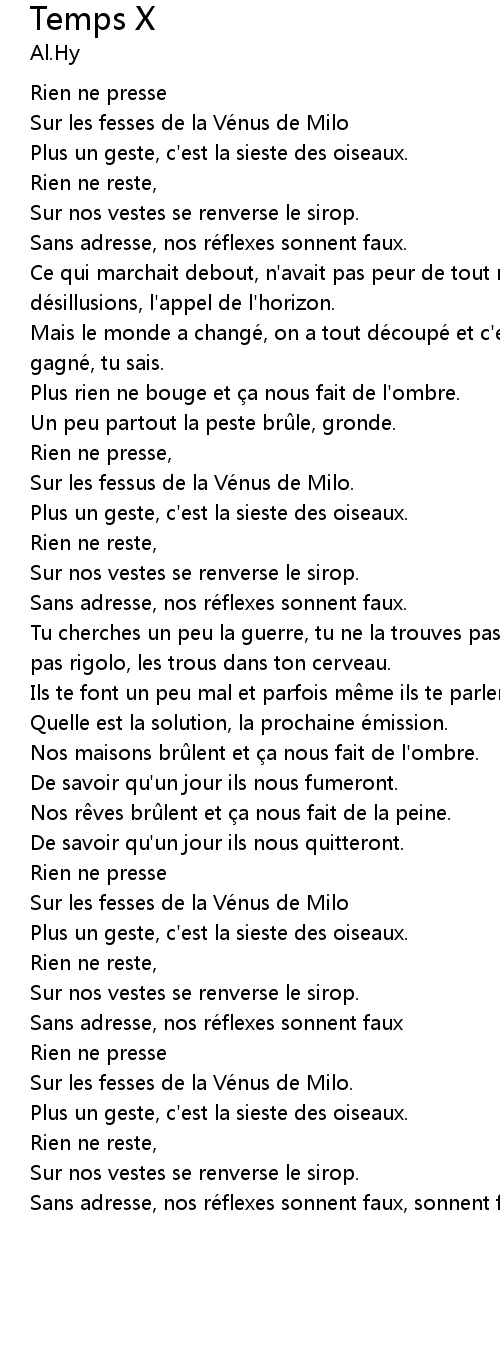 | [03:53.527] | Sans adresse, nos re flexes sonnent faux, sonnent faux, sonnent faux |
