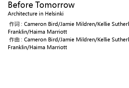 | [00:00.000] | 作词 : Cameron Bird/Jamie Mildren/Kellie Sutherland/Gus Franklin/Haima Marriott |